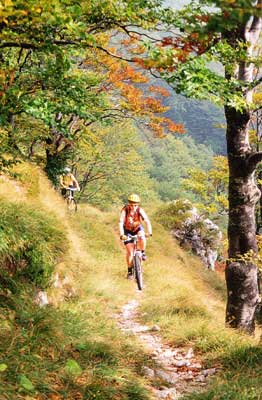 Milku seveda ni bilo treba dvakrat reči, če se nama pridruži. Že navsezgodaj smo se odpravili proti Tolminu in naprej do Tolminskih Raven. Za vzpon do Planine Razor smo izbrali klasično mulatjero, po kateri smo se vzpoli že prvič, pri turi Prečenje pl. Razor-izvir Tolminke. Tudi podroben opis poti do planine Dobrenjščica najdeš tam. Morda le to, da so nas med počitkom na planini Na Kalu dohiteli trije kolesarji, Gorazd, Zlatko in Dare. Ugotovili smo, da imamo skupno pot vse do prevala pri Prehodcih, nato pa so bili oni namenjeni do Bogatinskih Vratc, Komne in nato v Bohinj. Pot do Dobrenjščice in nato dolgo prečenje in težaven vzpon (opisan pri turi Po krnskih mulatjerah) so v dobri družbi hitro minili. Tam pa smo se razšli, oni so zavili desno proti krnici Za Lepočami, mi pa smo zavili levo v smeri markirane poti proti Krnu. Po kratkemu porivanju kolesa smo prišli na izravnavo. Tam se pot razširi in v lepem, mestoma izpostavljenem kolesarjenju te pripelje do sedla Prehodci. To je stičišče štirih poti. Pot naravnost vodi najprej proti Krnu, desno navzdol zavije pot proti Krnskih jezerom (lepa alternativa variante skozi Za Lepočami), naša pa zavije ostro levo. Po kratkem počitku smo se začeli spuščati. Mulatjera je na začetku dobro ohranjena in kmalu te pripelje do izpostavljenega mesta, kjer je pogled v globino izreden. Pod teboj je vsaj 300-400 metrov previsne stene. Nato sledi izpostavljeno prečenje pod stenami, kjer je pot precej odnesena, malo naprej pa prideš na zgornji rob omenjene plošče, preko katere se vije mulatjera v dolino. Prvi del je precej kamnit, vendar je vožnja mogoča, nato pa se pot izboljša in srednji omogoča uživanje v hitrem spustu. Niže pa na žalost naša pot pride v vpadnico ogromnega skalnega podora, ki je nastal med potresom pred nekaj leti, zato je pot vse bolj kamnita, ponekod pa je popolnoma zasuta. Zato je kolesarjenja vse manj, na koncu pa te čaka še zoprno prečenje podora. Končno prideš na melišče nad Planino Na Zgornjih Prodih. Tu se nekdaj navzdol vila lepa mulatjera, žal pa je ohranjena le še mestoma. Tako te do planine čaka nekaj mulatjere in precej potke preko melišča, vendar je vožnja večinoma kar mogoča. Pri planini pa se pot izboljša in v hitrem spustu po kar dobro ohranjeni poti se pripelješ do jezu pri Izviru Tolminke. Pot naprej je že znana; pri koči malo navzgor, nato po mestoma zasuti cesti navzdol do planine Polog in naprej do Tolmina in izhodišča.